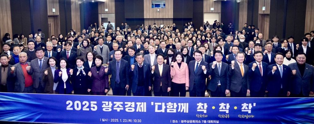 강기정 광주시장이 지난 1월 23일 광주상공회의소 대회의실에서 열린 '2025 광주경제 다함께 착착착'에 참석해 경제단체, 산업계 등 76개 기관단체 관계자들과 함께 소비는 늘리고, 부담은 줄이고, 투자는 키우는 경제대책에 나서기로 결의를 다진 뒤 기념촬영을 하고 있다. 광주시 제공