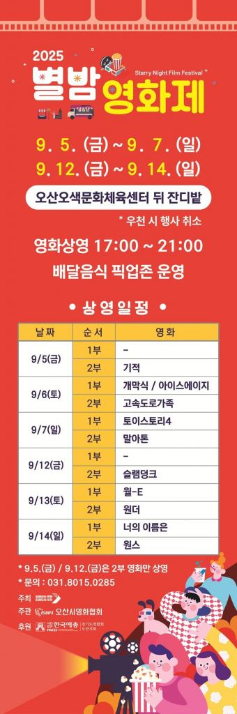 경기도 오산시는 5일부터 14일까지 매주 금·토·일요일 저녁 오색문화체육센터 뒤편 오산천에서 '오산천 별밤영화제'를 개최한다.