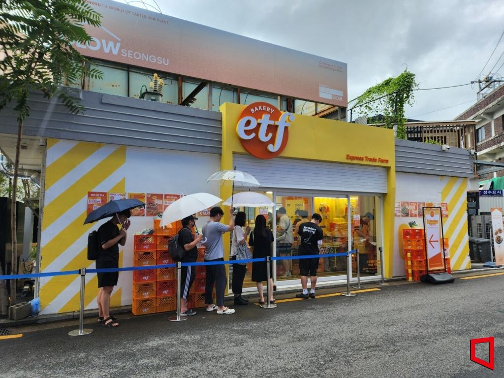 1일 오전 10시20분께 서울 성수동 'ETF 베이커리' 팝업스토어(임시 매장)는 문을 여는 11시를 앞두고 이미 대기 중인 인파로 붐볐다. 평일 오전임에도 대기 인원은 100여팀에 달했다. 비가 오락가락하고 늦더위가 기승을 부리는 궂은 날씨였지만, 손님들은 손부채질을 하며 대기행렬은 견뎠다. 야외에 설치된 대기 천막은 오전 10시30분도 채 되기 전에 대기 손님으로 가득 찼다.
