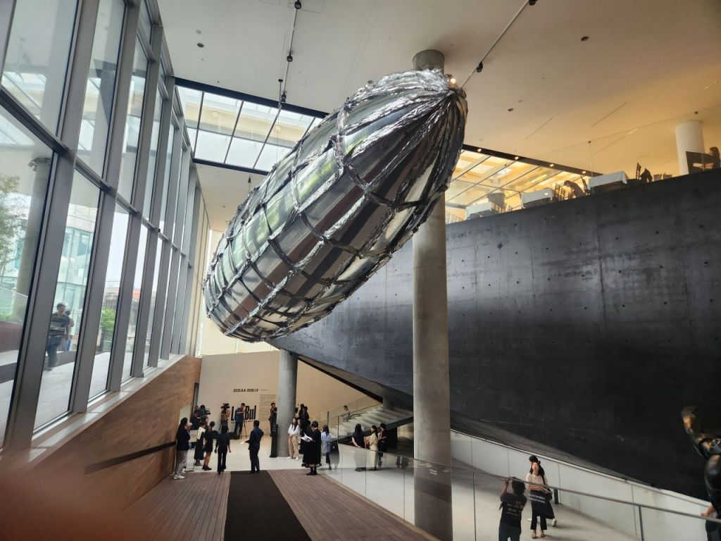 리움미술관에서 열리는 이불 작가의 서베이 전시 '이불: 1998년 이후' 내부 전경. 전시관 입구에서 17m 길이의 은빛 비행선을 형상화한 '취약할 의향-메탈라이즈드 벌룬'(2020) 작품이 시선을 사로잡는다. 서믿음 기자