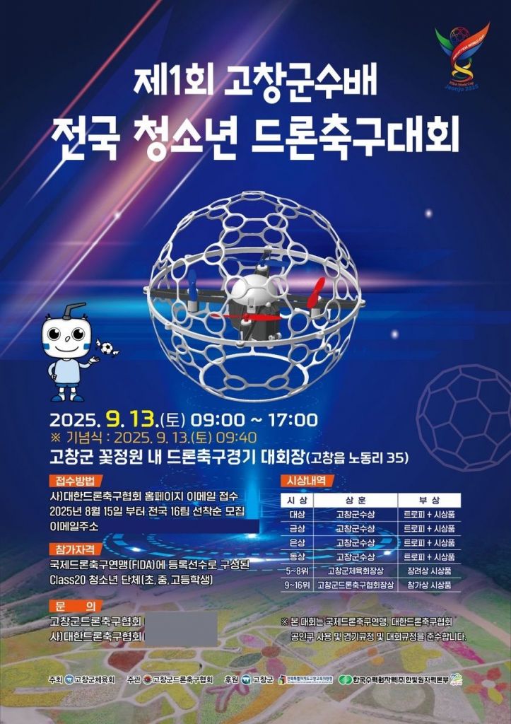 이날 대회는 국제드론축구연맹(FIDA)와 ㈔대한드론축구협회(KDSA)의 경기 규정에 따라 진행되며, 전국 단위 청소년 드론축구팀(Class 20) 16개 팀이 출전한다. 참가팀은 리그전과 토너먼트를 통해 최종 우승팀을 가리게 된다.