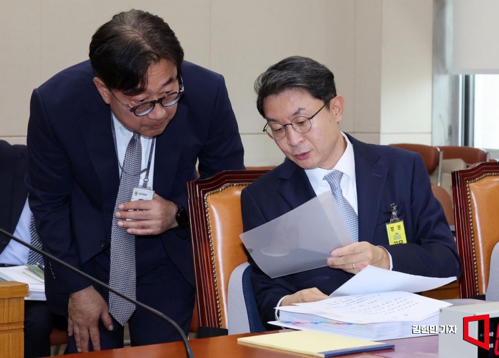 이억원 금융위원장 후보자가 2일 국회 정무위원회에서 열린 인사청문회에서 관계자와 대화하고 있다. 2025.9.2 김현민 기자