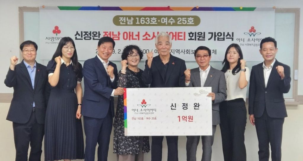 이번 가입으로 신정완 회원은 전남 사랑의열매 163호, 여수 25호 아너 소사이어티 회원이 됐으며, 1억원 기부를 완납해 정회원으로 이름을 올렸다.