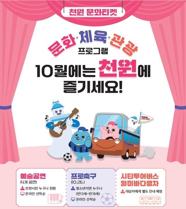 행사는 ▲시립합창단 연주회와 어린이 명작무대, 시민의 날 음악회, 한국무용 등 예술공연 ▲K리그 축구 경기 관람 ▲시티투어버스·월미바다열차 탑승 등 3개 분야로 나눠 진행된다.