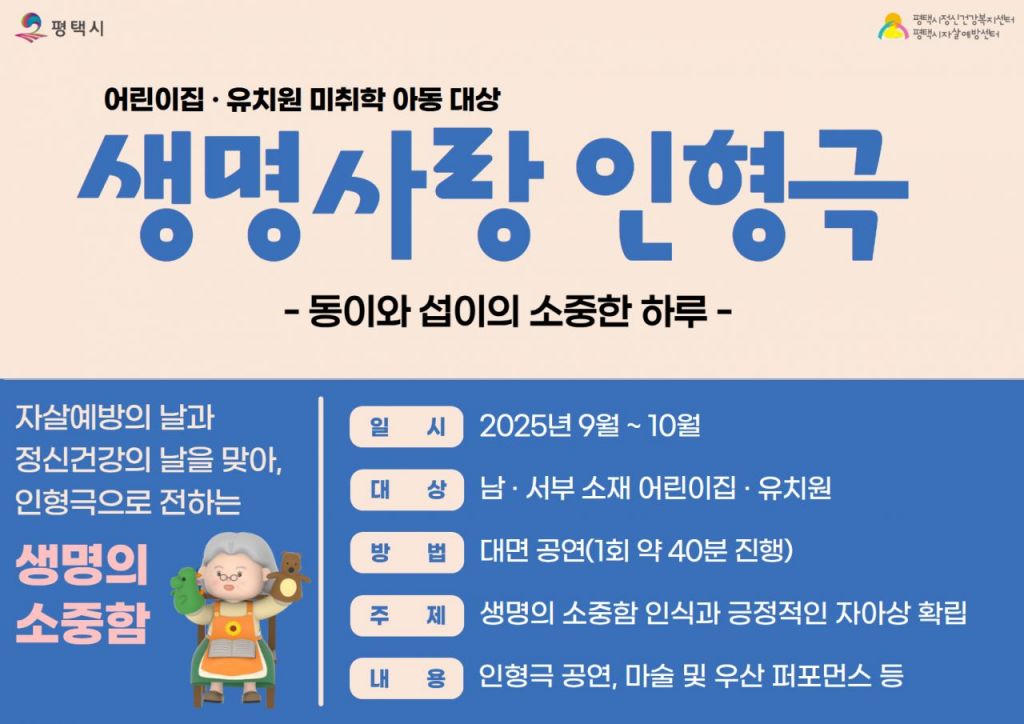 경기도 평택시는 오는 자살 예방의 날(9월 10일)과 정신건강의 날(10월 10일)을 맞아 이달부터 다음 달까지 미취학 아동 약 400명을 대상으로 '생명사랑 인형극' 순회공연을 개최한다.