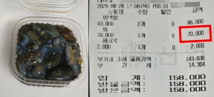 바가지 논란 일으킨 7만원어치 해삼(왼쪽)과 영수증. 회백반 2인 8만6000원 외에 회 7만원이 따로 부과돼 있다. 온라인 커뮤니티 캡처
