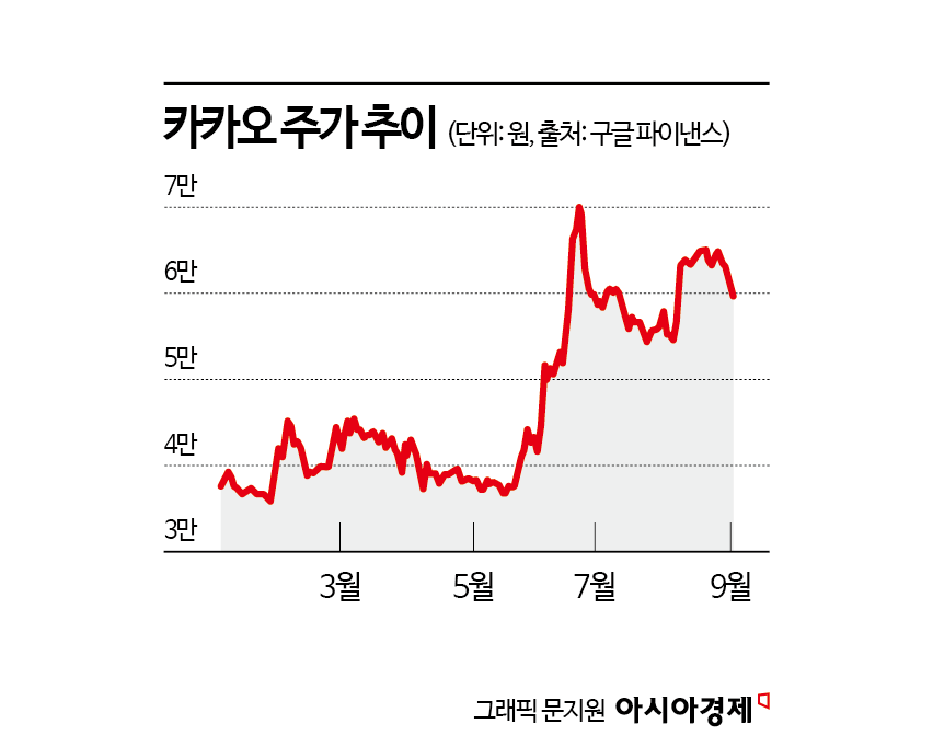 지난달 카카오의 상승세를 견인했던 외국인과 기관이 차익 실현에 나서면서 주가에 부담이 된 것으로 풀이된다. 앞서 외국인과 기관은 올해 8월 한 달간 카카오 주식을 각각 4888억원, 3858억원어치 사들이며 전체 순매수 종목 가운데 가장 많은 돈을 쏟아부었다. 같은 기간 개인이 8542억원어치를 내다 팔며 순매도 1위를 기록한 것과 대조적이다. 결국 카카오 주가는 지난달 7.76% 뛰며 경쟁사인 네이버(-8.72%)를 크게 따돌렸다.