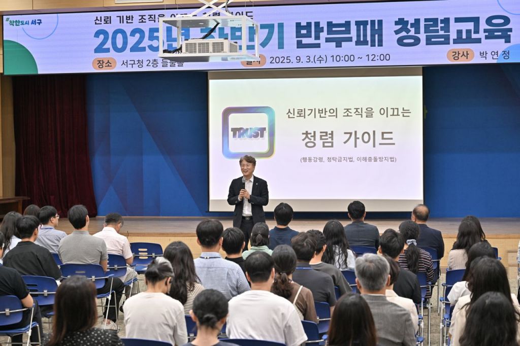 광주시 서구가 3일 서구청 들불홀에서 직원 대상으로 '신뢰 기반 조직을 이끄는 청렴 가이드'를 주제로 하반기 반부패 청렴교육을 실시했다. 광주 서구 제공