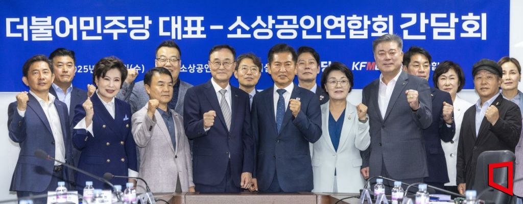 정청래 더불어민주당 대표와 송치영 소상공인연합회장을 비롯한 참석자들이 3일 서울 여의도 소상공인연합회에서 열린 정책간담회에 앞서 기념촬영을 하고 있다. 2025.9.3 국회사진기자단