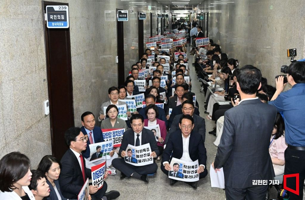 장동혁 국민의힘 대표, 송언석 원내대표 등 의원들이 3일 국회 원내대표실 앞 복도에서 특검의 압수수색을 비난하며 규탄농성을 하 있다.