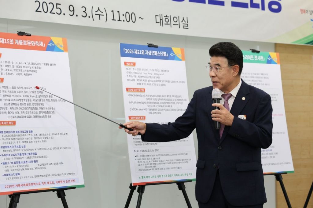 계룡시문화관광재단(이사장 이응우)은 3일 시청 대회의실에서 언론 브리핑을 열고 '2025계룡軍문화축제', '지상군페스티벌', '웰니스라이프', 'K-GDEX(계룡방산전시회)' 등 4대 행사를 17일 개최한다고 밝혔다.