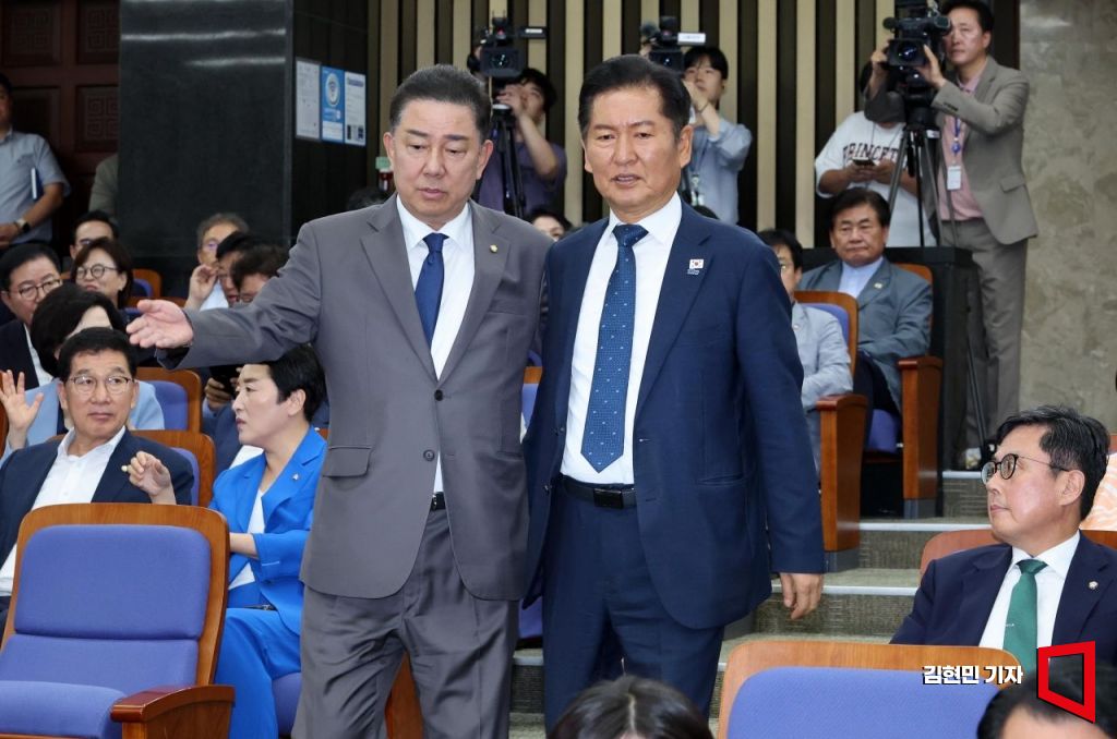 정청래 더불어민주당 대표와 김병기 원내대표가 3일 국회에서 열린 정책의원총회에 참석하고 있다. 2025.9.3 김현민 기자