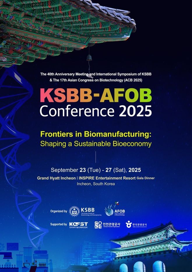 한국생물공학회(KSBB)와 아시아생물공학연합체(ACB2025)가 공동 주최하고, 한국과학기술단체총연합회와 인천관광공사 등이 후원하는 'KSBB-AFOB 콘퍼런스 2025'가 오는 23일부터 27일까지 인천 그랜드 하얏트 호텔에서 개최된다.