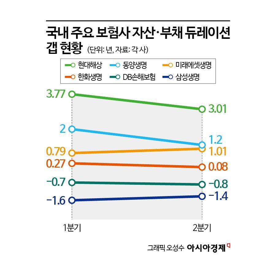 최근 보험사들은 ALM 관리에 적극 나서고 있다. 올해 1분기 삼성생명의 듀레이션 갭은 -1.6년이었지만 2분기엔 -1.4년으로 줄었다. 한화생명의 1분기 듀레이션 갭은 0.27년에서 2분기 0.08년으로 감소했다. 같은 기간 동양생명(2년→1.2년)·미래에셋생명(0.79년→1.01년)·현대해상(3.77년→3.01년) 등도 갭을 줄였다. DB손해보험은 1분기 -0.7년에서 2분기 -0.8년으로 갭이 소폭 확대됐다.