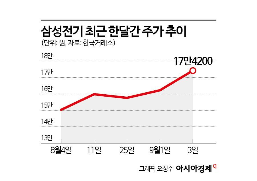 삼성전기가 연일 신고가를 갈아치우고 있다. 업황 개선에 올해 3분기 호실적 전망까지 더해지며 기관과 외국인 매수세 유입이 지속되고 있기 때문이다. 증권가에서도 삼성전기가 본격 리레이팅(재평가) 구간에 진입했다고 보고 속속 눈높이를 상향 조정하고 있다.
