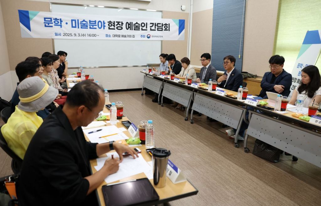 최휘영 문화체육관광부 장관이 3일 서울 종로구 예술가의집에서 문학·미술분야 현장 예술인을 만나 현장 의견을 수렴하고 있다. [사진 제공= 문화체육관광부]