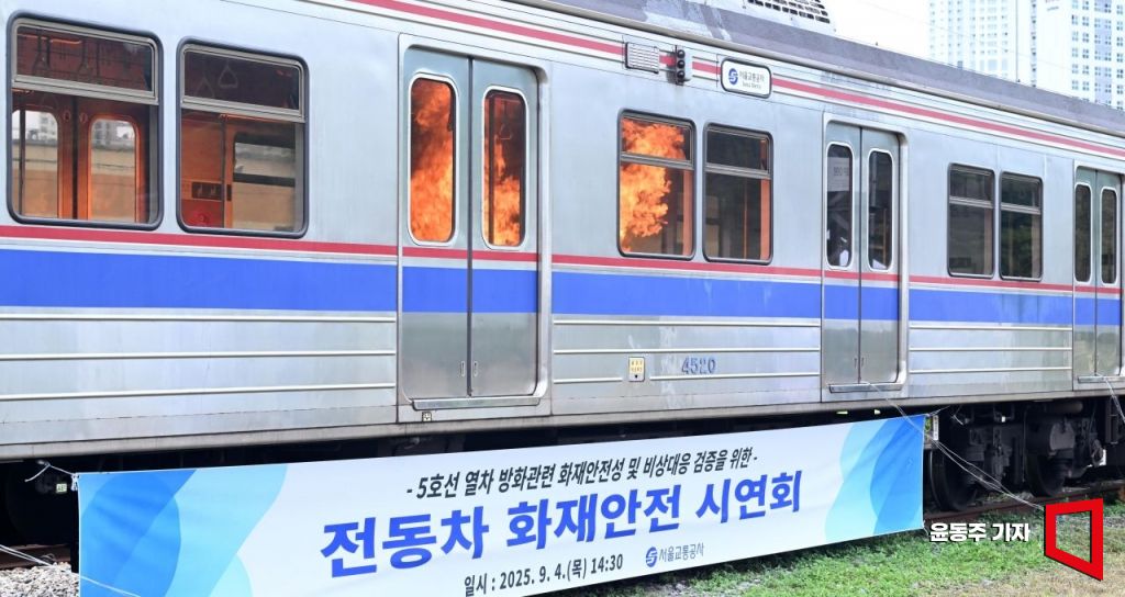 4일 경기도 고양시 지축차량기지에서 열린 전동차 화재 시연에서 전동차 객실 내부에 화재가 발생하고 있다.