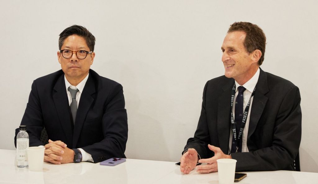 사이먼 폭스 프리즈 최고경영자(오른쪽)와 패트릭 리 프리즈 서울 대표가 4일 서울 강남구 코엑스에서 기자 간담회를 하고 있다. 연합뉴스