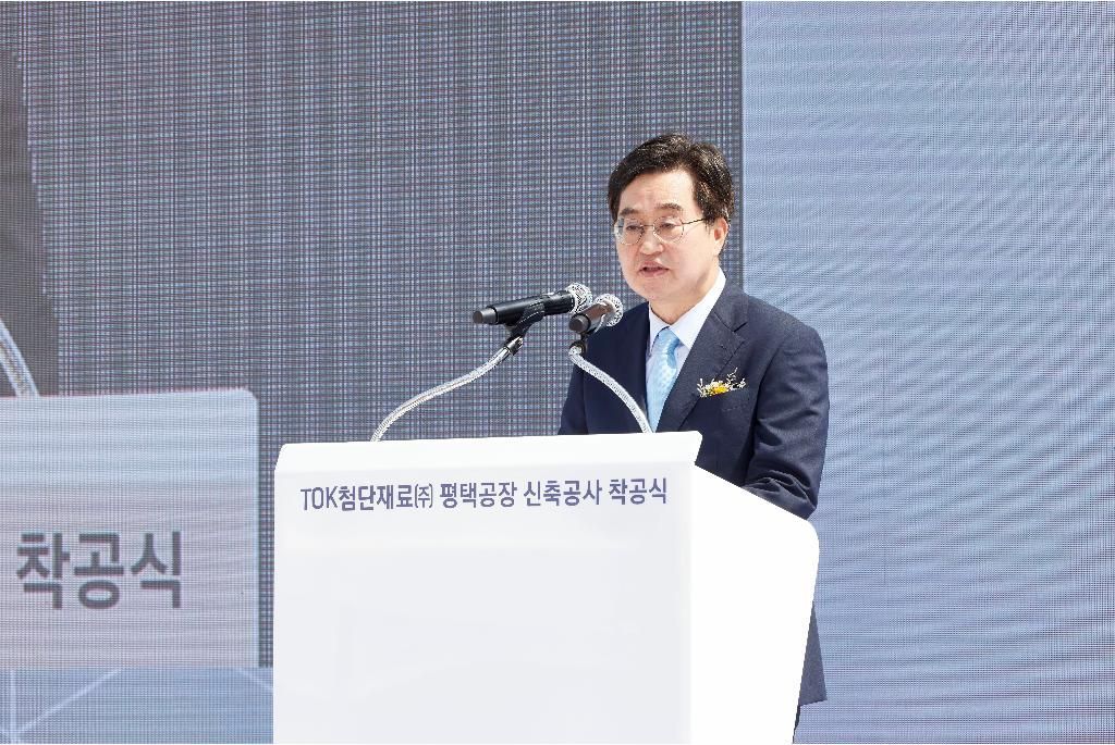 김동연 경기도지사가 지난달 20일 민생경제 현장투어 첫 일정으로 TOK첨단재료 평택포승공장 착공식에 참석해 축사를 하고 있다. 경기도 제공