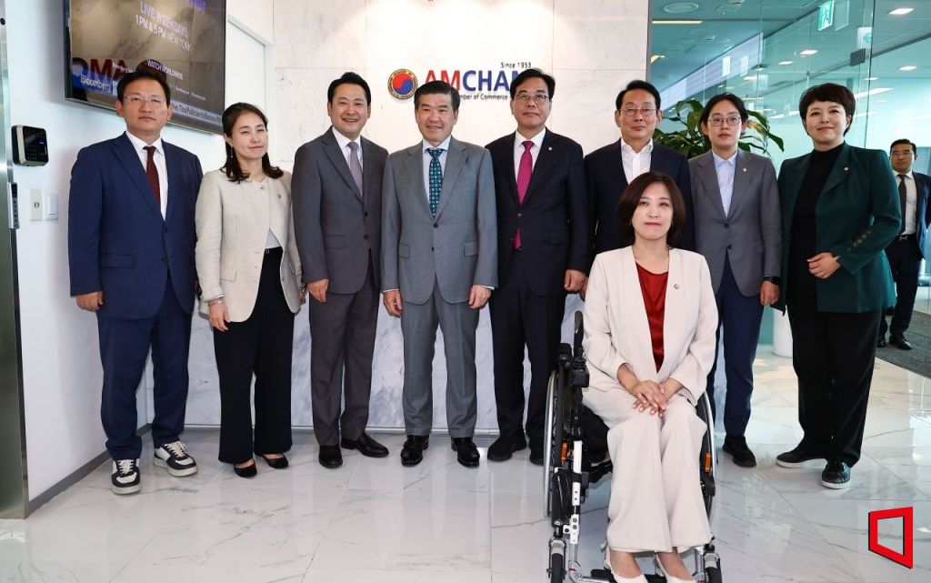 4일 서울 여의도 IFC 주한미국상공회의소에서 열린 국민의힘 - 주한미국상공회의소(AMCHAM)간담회에 앞서 참석자들이 기념촬영 하고 있다. 왼쪽부터 국민의힘 김형동 환경노동위원회 간사, 김소희 환경노동위원회 위원, 장동혁 대표, 제임스 김 암참 회장 겸 대표이사, 국민의힘 송언석 원내대표, 김도읍 정책위의장, 조지연 환경노동위원회 위원, 김은혜 원내수석부대표, 앞줄 최보윤 수석대변인. 2025.9.4 국회사진기자단