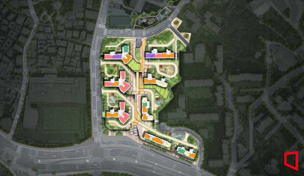 경사가 있는 지형 특성을 활용한 친환경적 설계도 적용했다. 단차 하부에는 근린생활시설을 배치해 활용도를 높이고, 공간 구성이 어려운 부분은 자연석 쌓기 등 벽면 녹화를 계획했다.