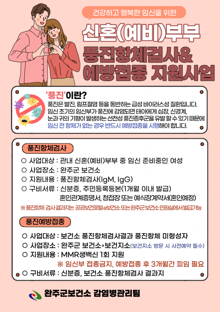 전북 완주군이 건강하고 안전한 임신을 돕기 위해 신혼(예비)부부 여성을 대상으로 풍진 항체검사와 예방접종 지원사업을 추진한다.