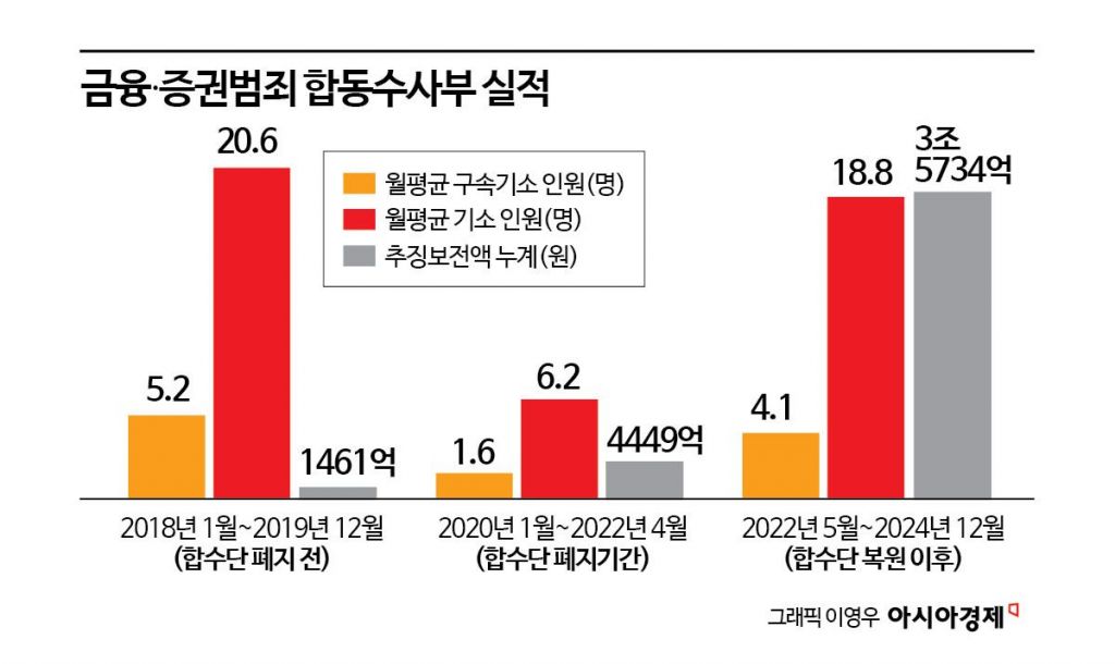 추징보전액도 폐지 기간 총 4449억원에서, 복원 이후 3조5734억원으로 8배 이상 늘었다. 합수부는 테라·루나 사건에서 2333억원, 영풍제지 주가조작 사건에서 2789억원, SG증권발 주가조작 사건에서 7305억원 등을 추징보전했다.