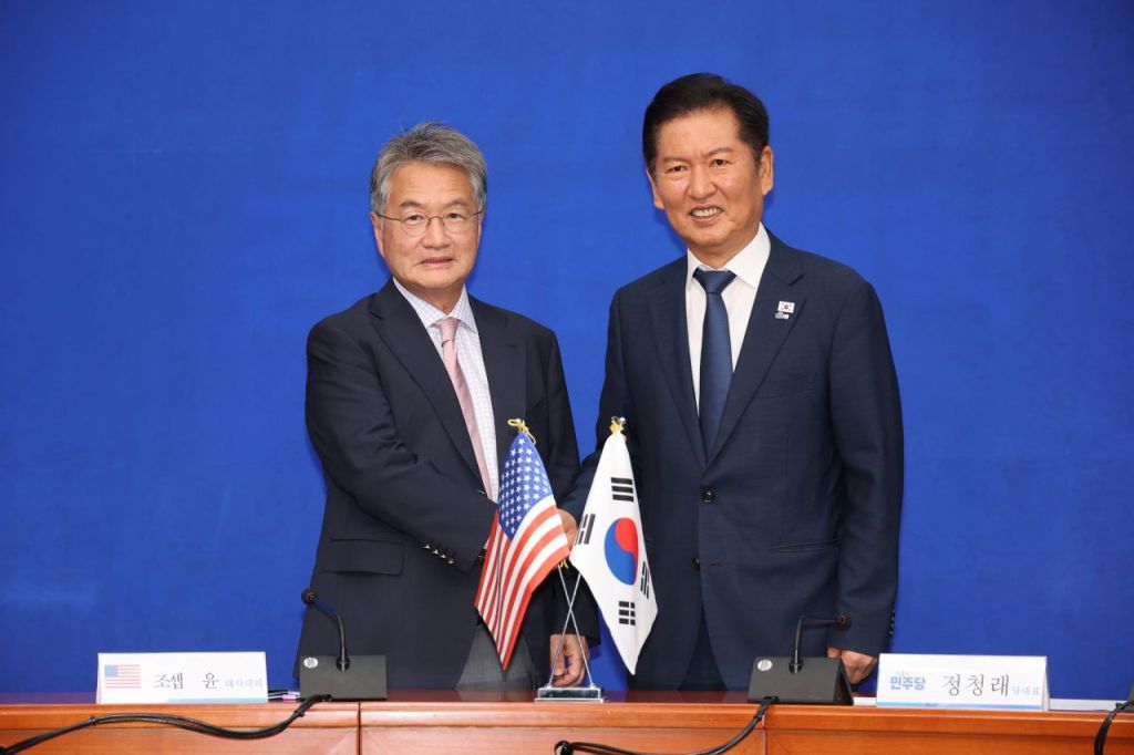 정청래 더불어민주당 당대표는 조셉 윤 주한미국대사대리와 만나 "이재명 대통령이 오는 23일 유엔총회에서 유엔안전보장이사회 이사장 자격으로 공개토론을 주재한다"며 "다시 미국에서 트럼프 대통령과 만날 기회가 있었으면 좋겠다"고 밝혔다.