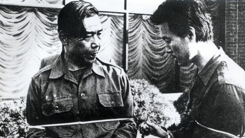 1979년 당시 사건 현장을 재연하고 있는 김재규 전 중장정보부장(왼쪽). 연합뉴스