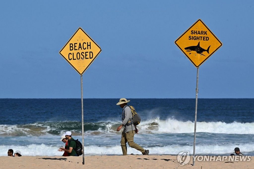난 6일(현지시간) 호주 시드니 바닷가에서 서핑하던 남성이 상어에 물려 숨진 이후 '상어 출현', '해변 폐쇄' 표지판이 설치된 모습. AFP 연합뉴스
