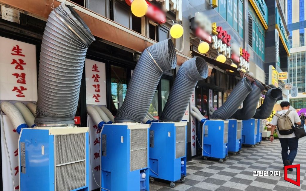 서울의 한 고깃집 전면에 냉풍기가 가득 설치됐다. 역대급 폭염에 에어컨만으로는 역부족이었을 터. 불황 속 자영업자들의 절절한 노력이 눈물겹다. 김현민 기자