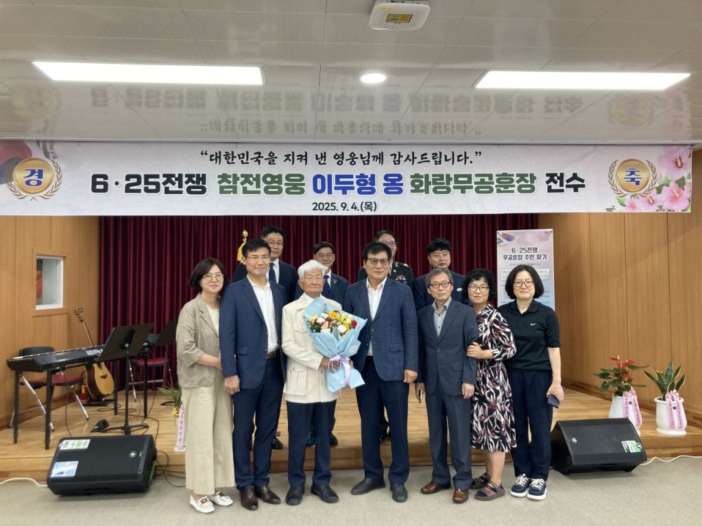 지난 4일 학교면 학나래문화센터에서 열린 무공수훈훈장 전수식에는 6·25 전쟁 참전 영웅 이두형 상사(97)와 이상익 함평군수, 지역 기관·단체 관계자, 군 관계자, 유공 가족 등 70여명이 참여했다.