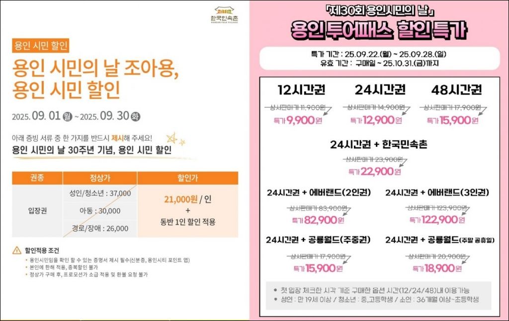 한국민속촌은 30일까지 용인 시민에게 입장권을 2만1000원의 특별가로 제공한다. 현장 매표소에서 신분증을 제시하거나 '용인시티포인트' 앱을 활용해 할인 혜택을 받을 수 있다.