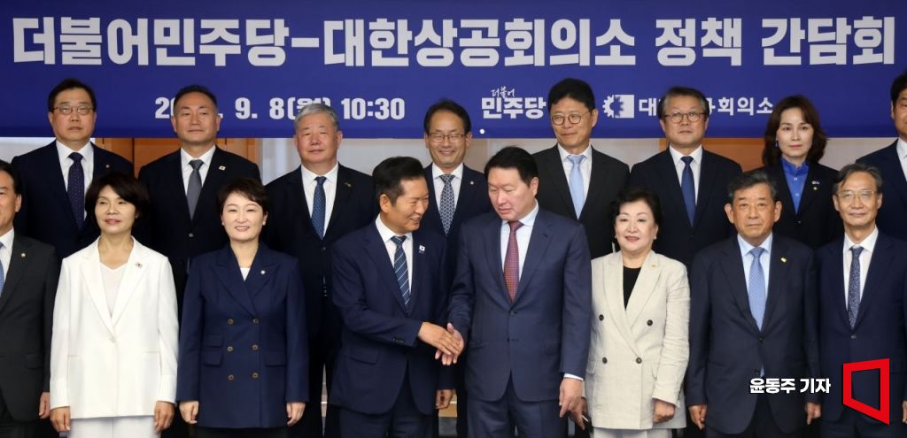 8일 서울 중구 대한상의에서 열린 '더불어민주당-대한상의 정책간담회'에 참석한 정청래 민주당 대표와 최태원 대한상의 회장 등 참석자들이 간담회 시작에 앞서 기념사진을 찍고 있다.