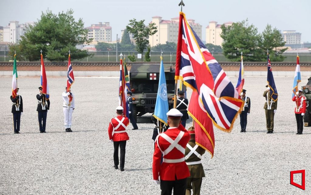 유엔군사령부 깃발을 비롯한 참가국 깃발이 8일 오전 경기 평택시 캠프험프리스 바커필드 연병장에서 열린 유엔사 창립 기념행사에 입장하고 있다. 1950년 7월 7일 창설된 유엔군사령부(유엔사)는 호주, 벨기에, 캐나다, 콜롬비아, 덴마크, 프랑스, 독일, 그리스,이탈리아, 네덜란드 , 뉴질랜드, 노르웨이, 필리핀, 남아프리카 공화국, 태국, 터키, 영국, 미국으로 구성돼 있고 대한민국은 주둔국으로 참가하고 있다. (2025. 07. 08 사진공동취재단)