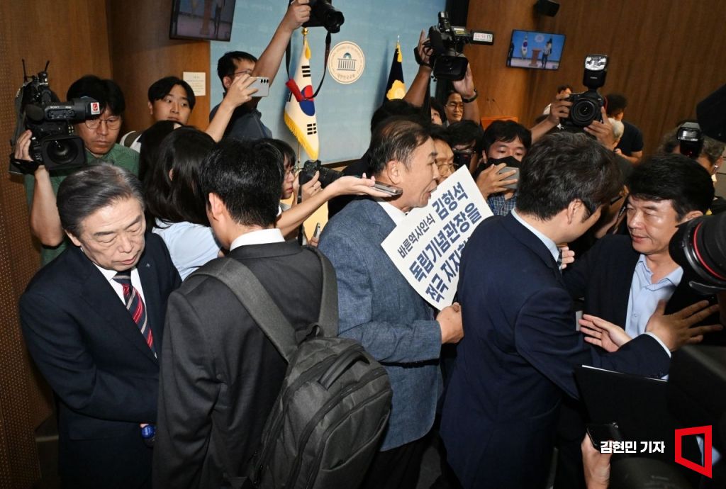김형석 독립기념관장이 8일 국회 소통관에서 '독립기념관 바로 세우기' 기자회견을 마친 뒤 퇴장하다 문진석 더불어민주당 의원의 항의를 받으며 설전을 벌이고 있다.