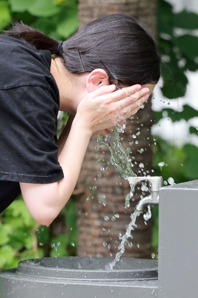서울 광화문광장에서 한 시민이 세수하고 있다. 연합뉴스