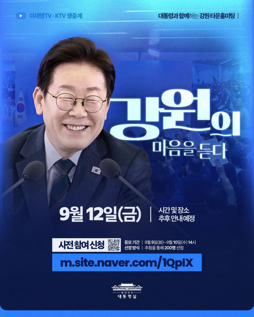 이 대통령은 9일 자신의 사회관계망서비스(SNS)를 통해 "대통령과 함께 토론할 200명의 강원특별자치도민을 모신다"고 알렸다. 타운홀 미팅 신청은 이날부터 10일 14시까지 받는다.