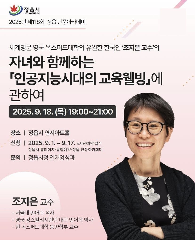전북 정읍시는 오는 18일 열리는 제118회 단풍아카데미에 옥스퍼드대 조지은 교수를 초청해 강연을 진행한다고 9일 밝혔다.