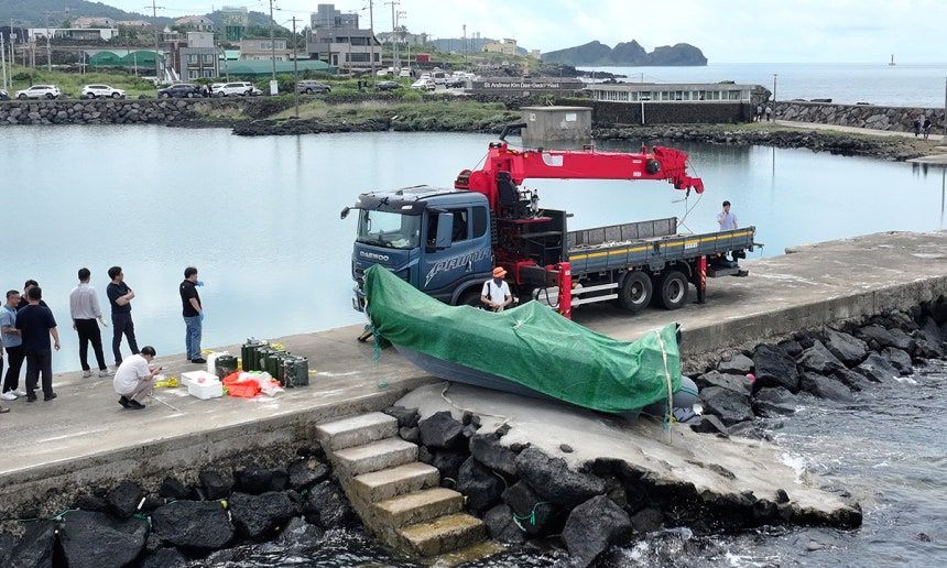 해경과 경찰 등 관계자들이 지난 8일 제주시 한경면 용수리 해안가에서 이날 오전 발견된 미확인 보트를 조사해 인양하려 하고 있다. 연합뉴스