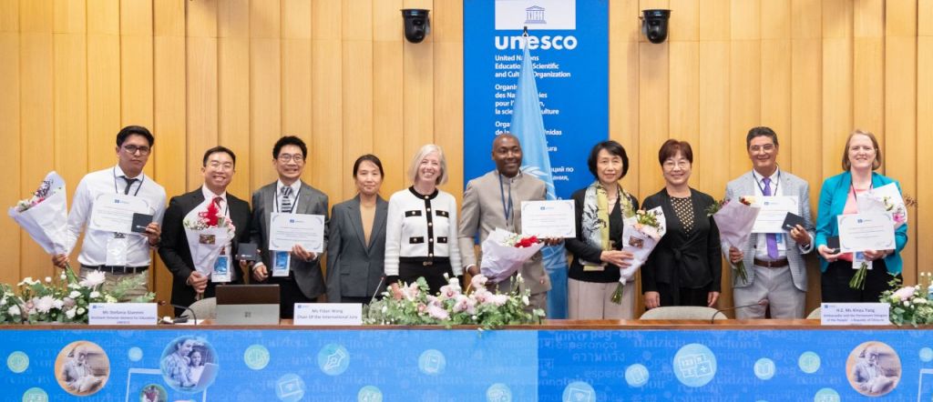 '2025년 유네스코 세종대왕 문해상'을 받은 수상자들이 지난 8일(현지시간) 프랑스 파리의 유네스코 사무국에서 열린 시상식에서 기념사진을 찍고 있다. [사진 제공= 문화체육관광부]