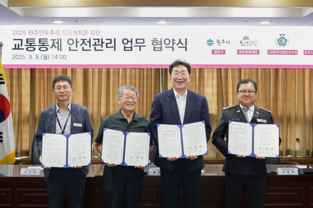 강원도 원주시는 오는 10월 24일부터 26일까지 열리는 '2025 원주만두축제'의 성공적인 개최를 위해 지난 8일 시청 7층 투자상담실에서 원주시자율방범연합대 및 (사)원주모범운전자회와 교통 통제·안전관리 협약을 체결했다.