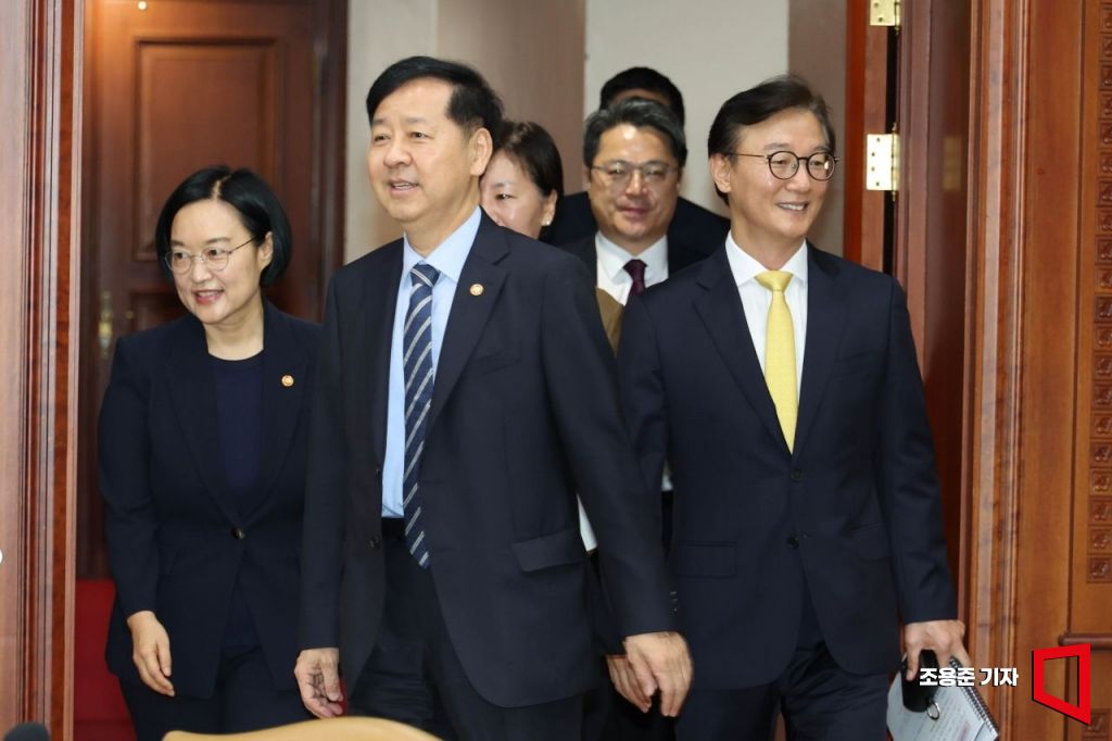 구구윤철 경제부총리 겸 기획재정부 장관이 10일 서울 종로구 정부서울청사에서 열린 성장전략TF 겸 산업경쟁력강화 관계장관회의에 참석 하고 있다. 왼쪽부터 한성숙 중소벤처기업부 장관, 구부총리, 송미령 농림축산식품부 장관, 문신학 산업통상자원부차관 , 전재수 해양수산부 장관.