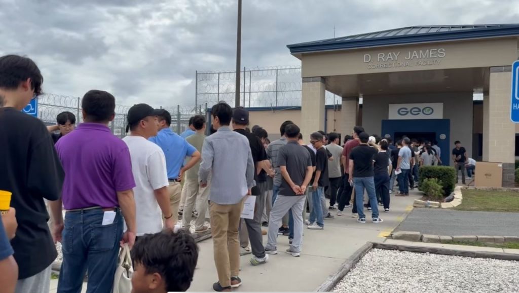 지난 7일(현지시간) 미 조지아주 포크스턴 이민세관단속국(ICE) 구금시설 앞에서 관계사 직원들이 면담을 기다리고 있다. 연합뉴스