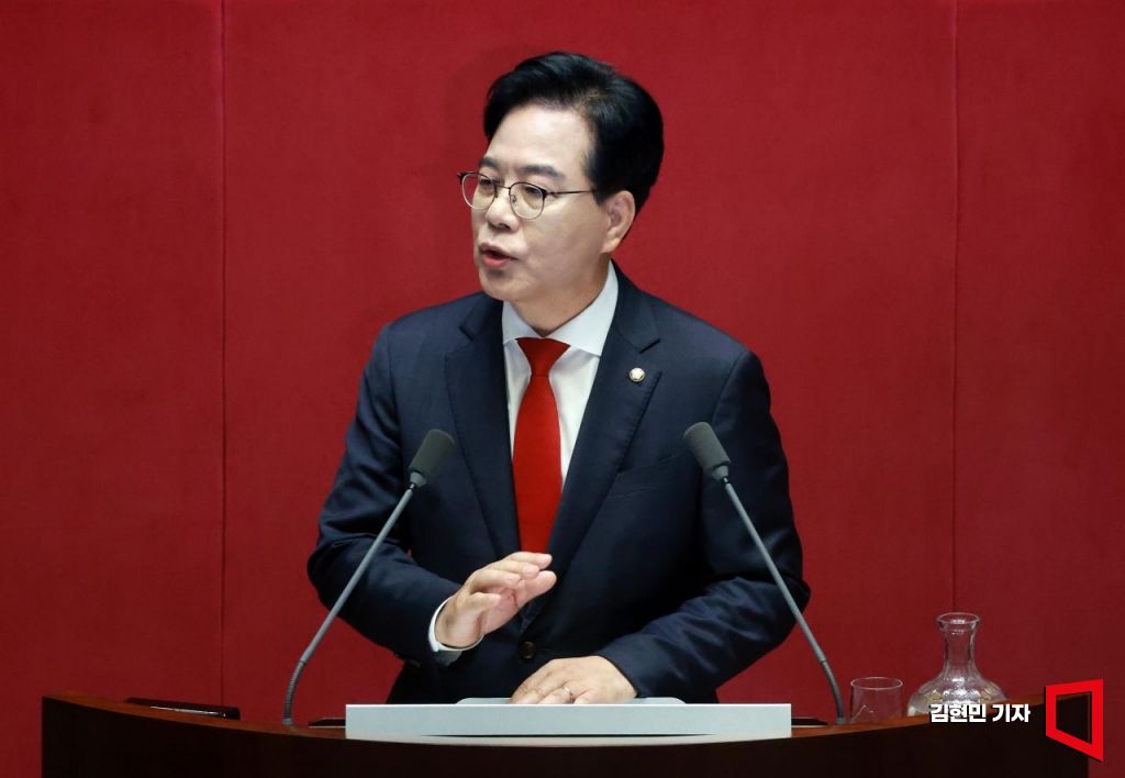 송언석 국민의힘 원내대표가 10일 국회에서 열린 본회의에서 교섭단체 대표 연설을 하고 있다.