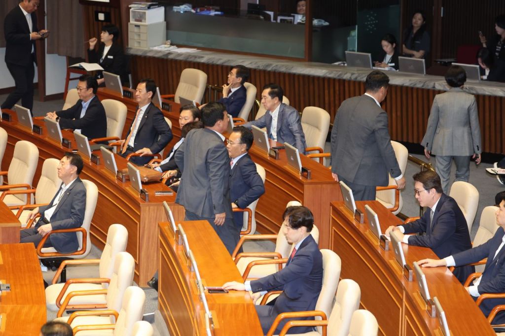 불법 정치자금 수수 혐의로 구속 영장이 청구된 권성동 국민의힘 의원(사진 오른쪽)이 9일 자신의 체포동의안이 보고되는 국회 본회의에 출석해 송언석 국민의힘 원내대표(사진 왼쪽)와 악수하고 있다. 연합뉴스