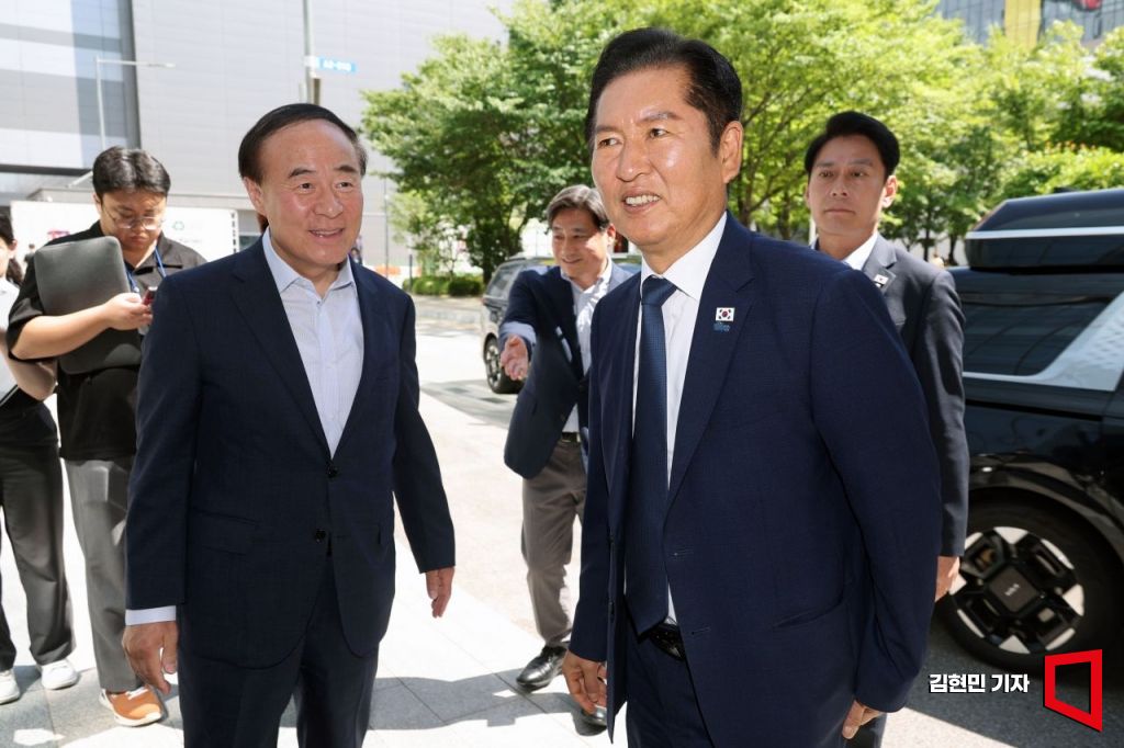 정청래 더불어민주당 대표가 반도체산업 발전을 위한 현장 간담회를 위해 10일 삼성전자 팽택캠퍼스를 방문해 전영현 삼성전자 DS 부문장(왼쪽)의 영접을 받고 있다. 2025.9.10 국회사진기자단
