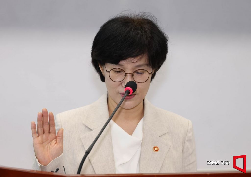 원민경 신임 여성가족부 장관이 10일 서울 종로구 정부서울청사에서 열린 취임식에 참석, 선서를 하고 있다. 2025.9.10 조용준 기자