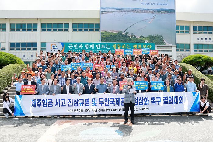 전남 무안군 사회단체와 무안국제공항 활성화 추진위원회가 무안국제공항의 장기 폐쇄와 재개항 지연 사태에 대해 강력히 반발하며 정부와 전라남도에 책임 있는 대책을 촉구하고 나섰다.