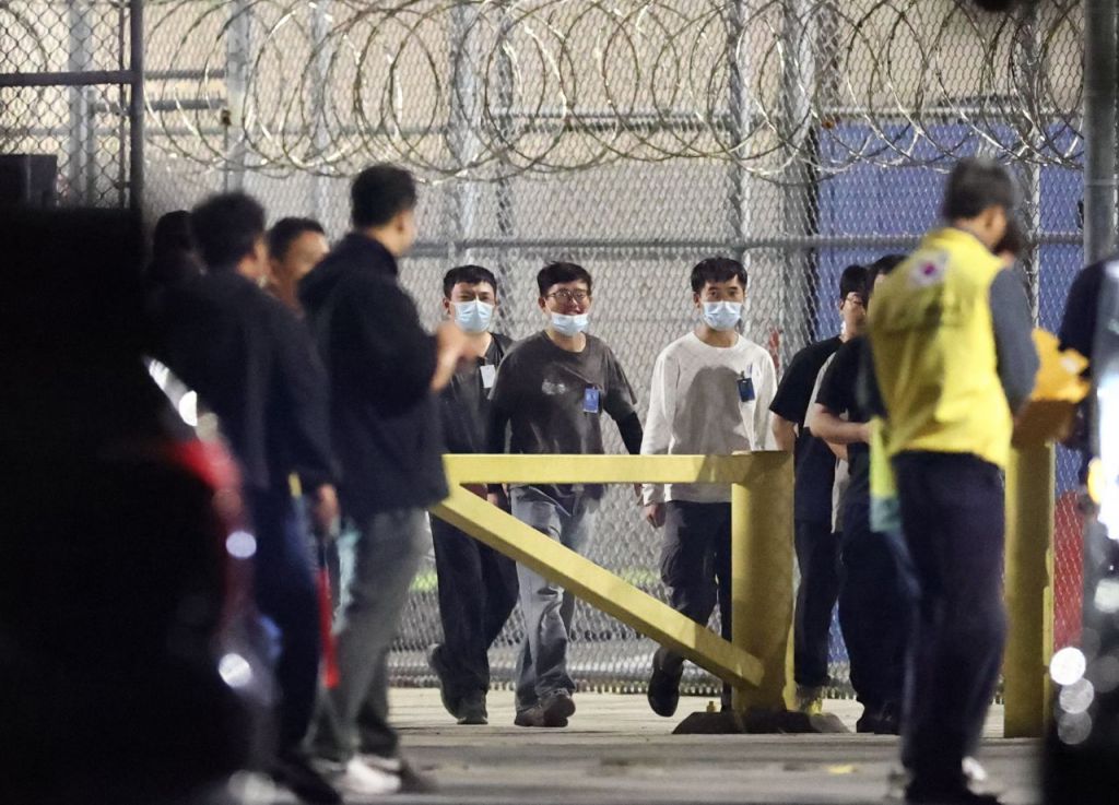 이민단속으로 체포됐던 현대차-LG엔솔 배터리공장 건설 현장 직원들이 애틀랜타 공항으로 향하기 위해 11일(현지시간) 미국 조지아주 포크스턴의 이민세관단속국(ICE) 구금시설을 나서고 있다. 연합뉴스